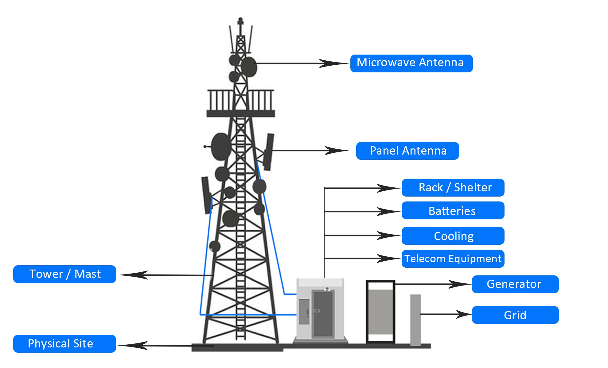 पावर सप्लाई और बैटरी: बिजली न होने पर भी टावर चलता रहे इसके लिए बैकअप दिया जाता है।